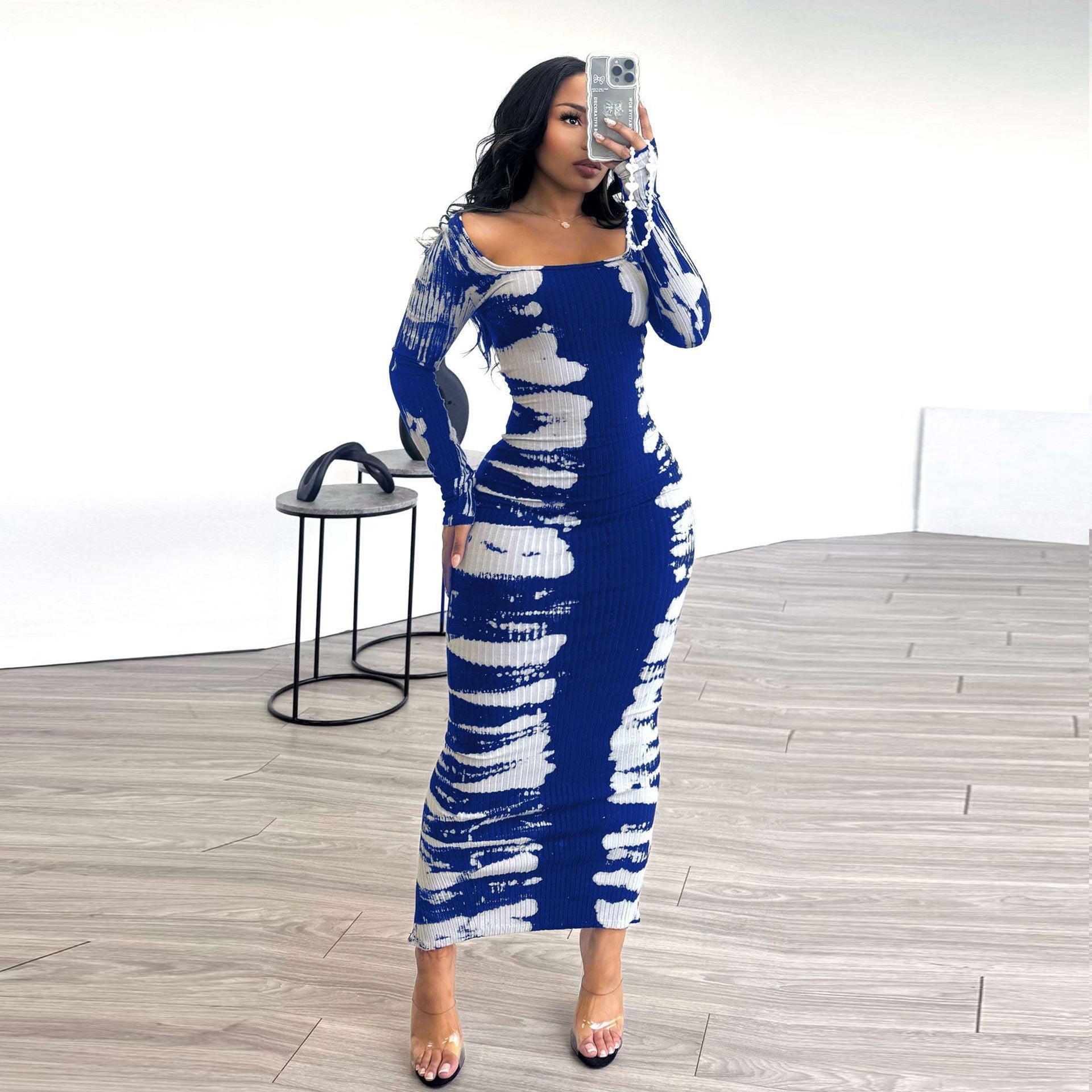 Elastic hip-hugging printed bodycon dress with slits at the back